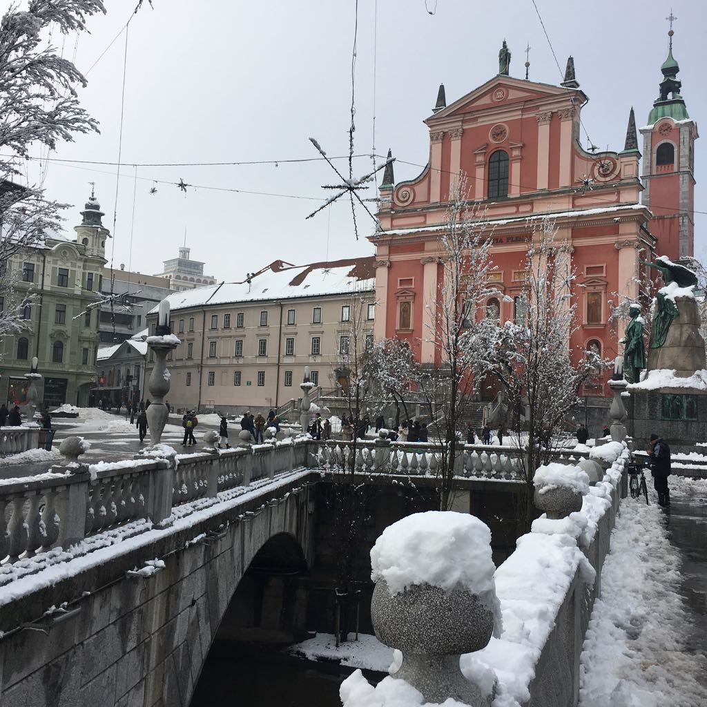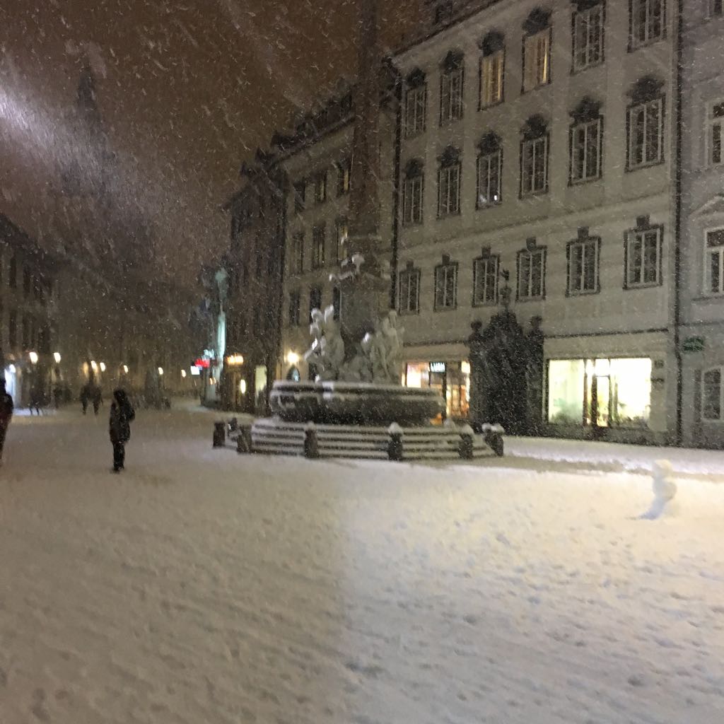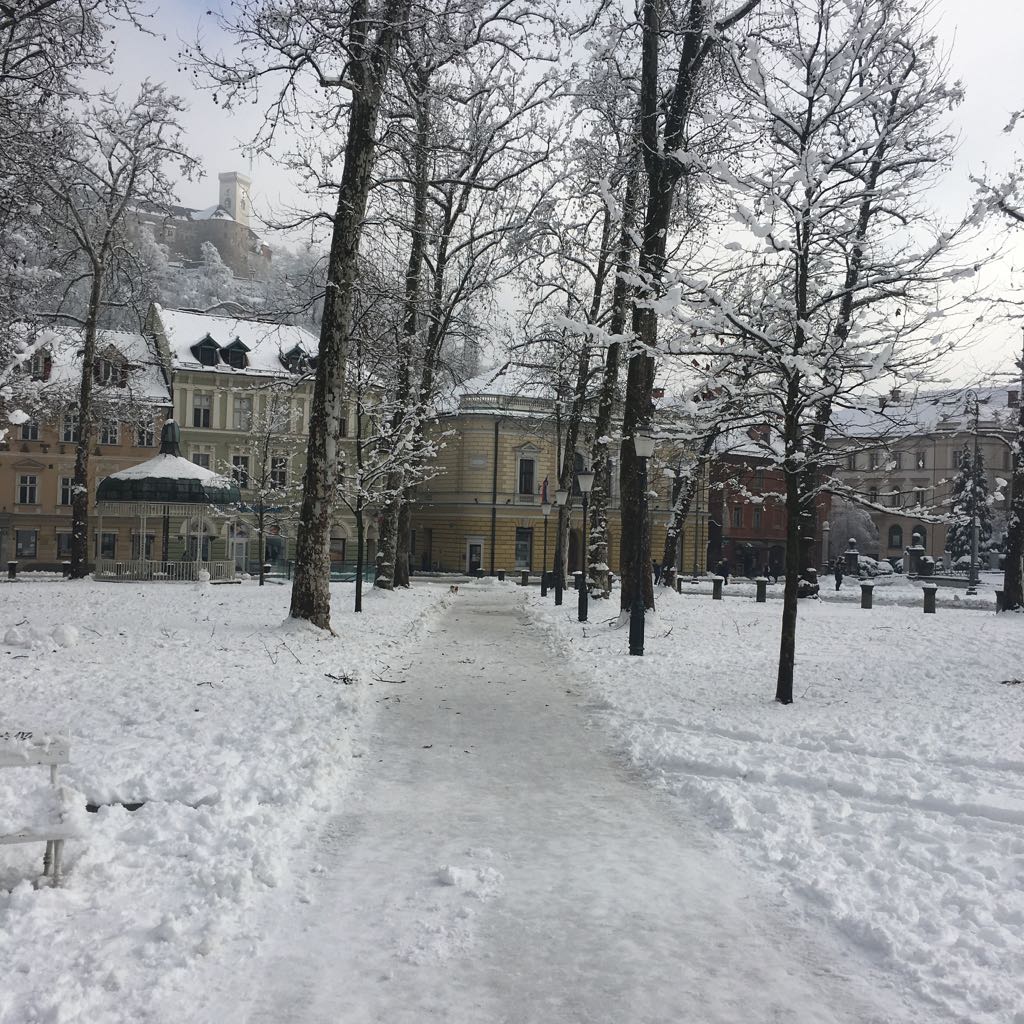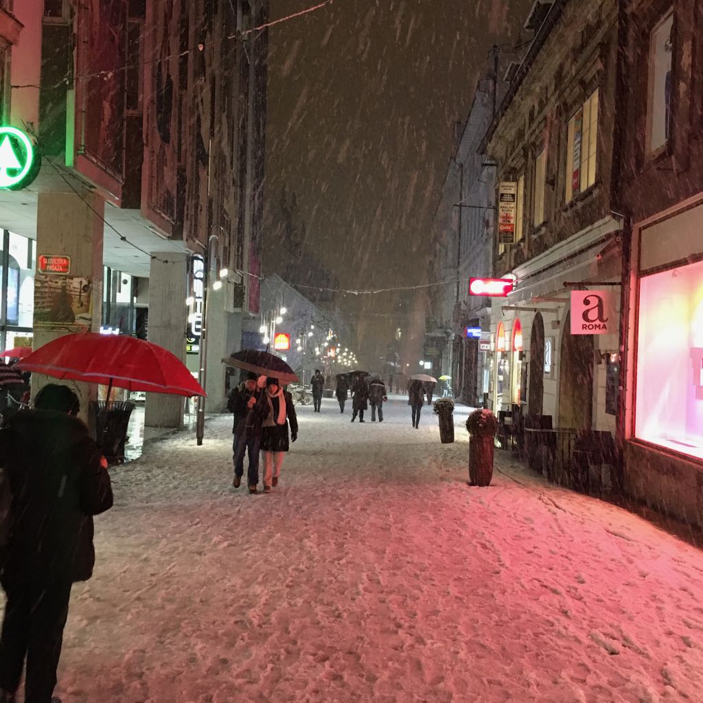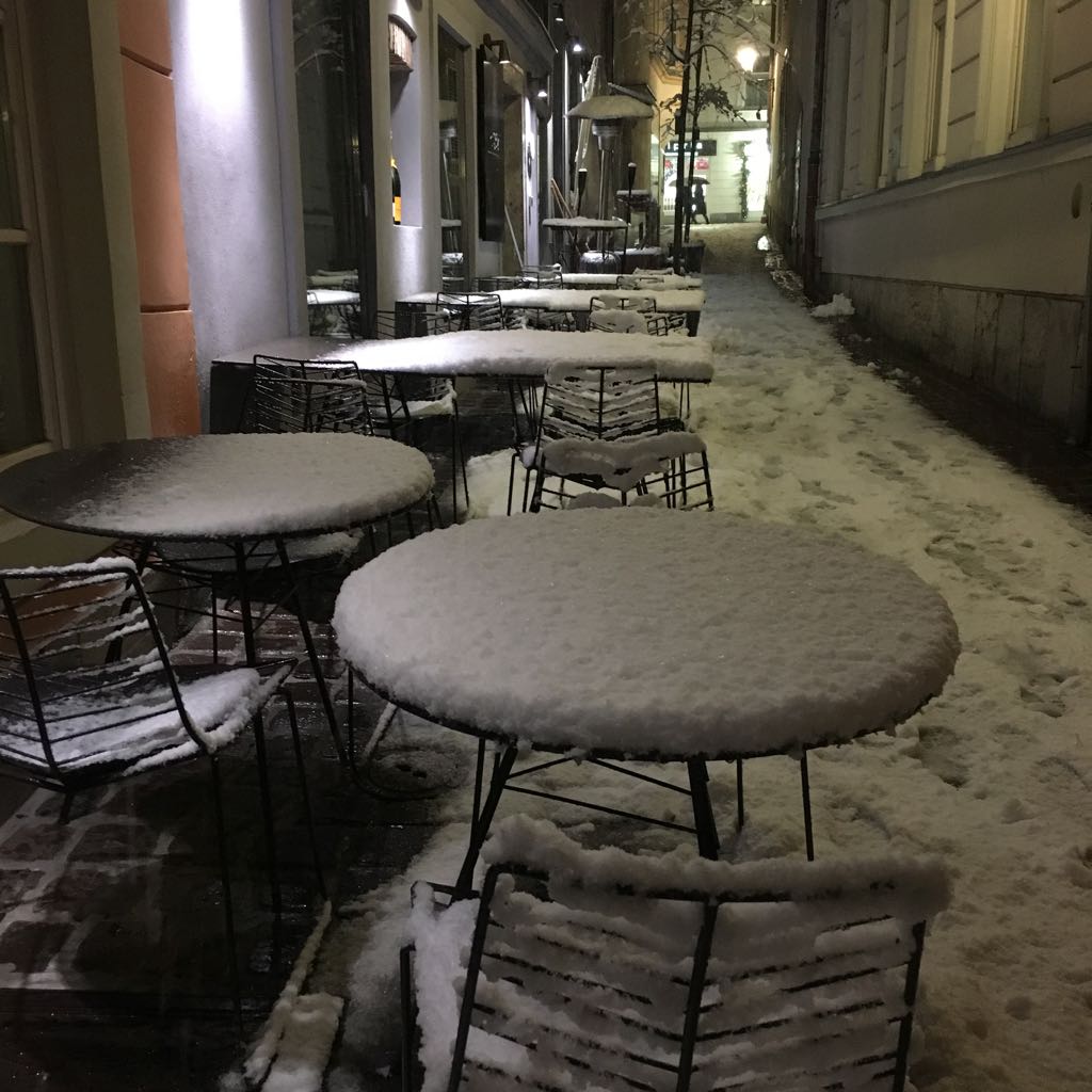Ko na petek 13. končno zapade sneg, je mesto prazno, lepo bi bilo videt, vse lučke in okrašeno mesto še v snegu. Mogoče v naslednjem decembru, če bo sneg.