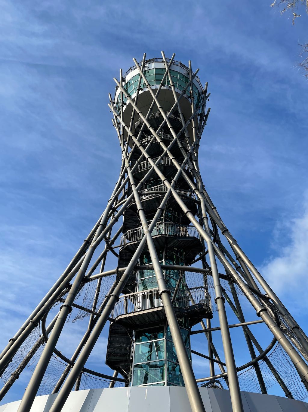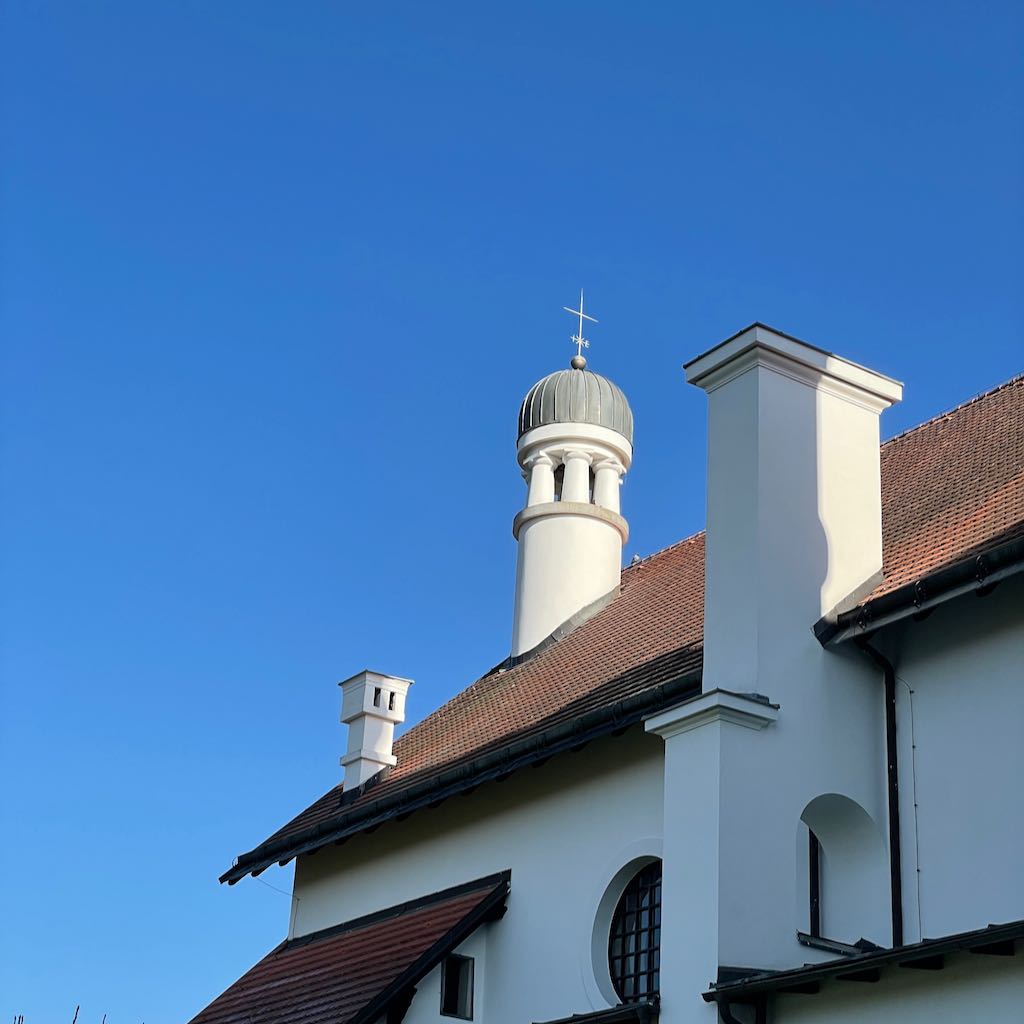 Ob muzeju moderne umetnosti se še oblaki postavijo vzporedno s stranico stavbe.