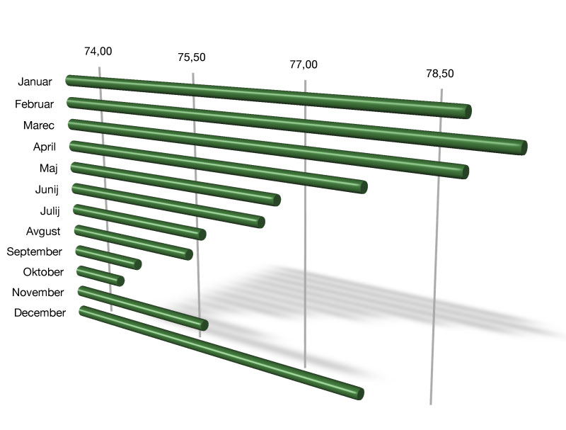 Tega najbrž ne dela vsak (moški), podatek iz koledarja sem prepisal v Numbers in naredi izračun. Najnižja številka 74,7 v oktobru in najvišja 79,5 februarja. Ja to je gibanje moje teže, spet moram hujšat, takoj po novem letu začnem, ali bom dal raje tehtnico kalibrirat bolj enostavno.