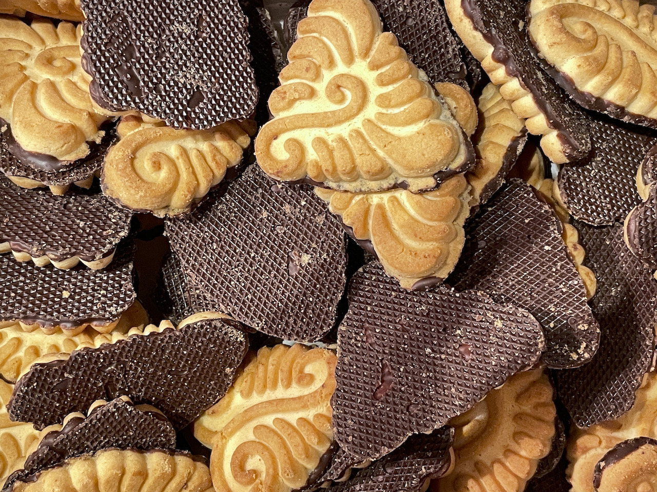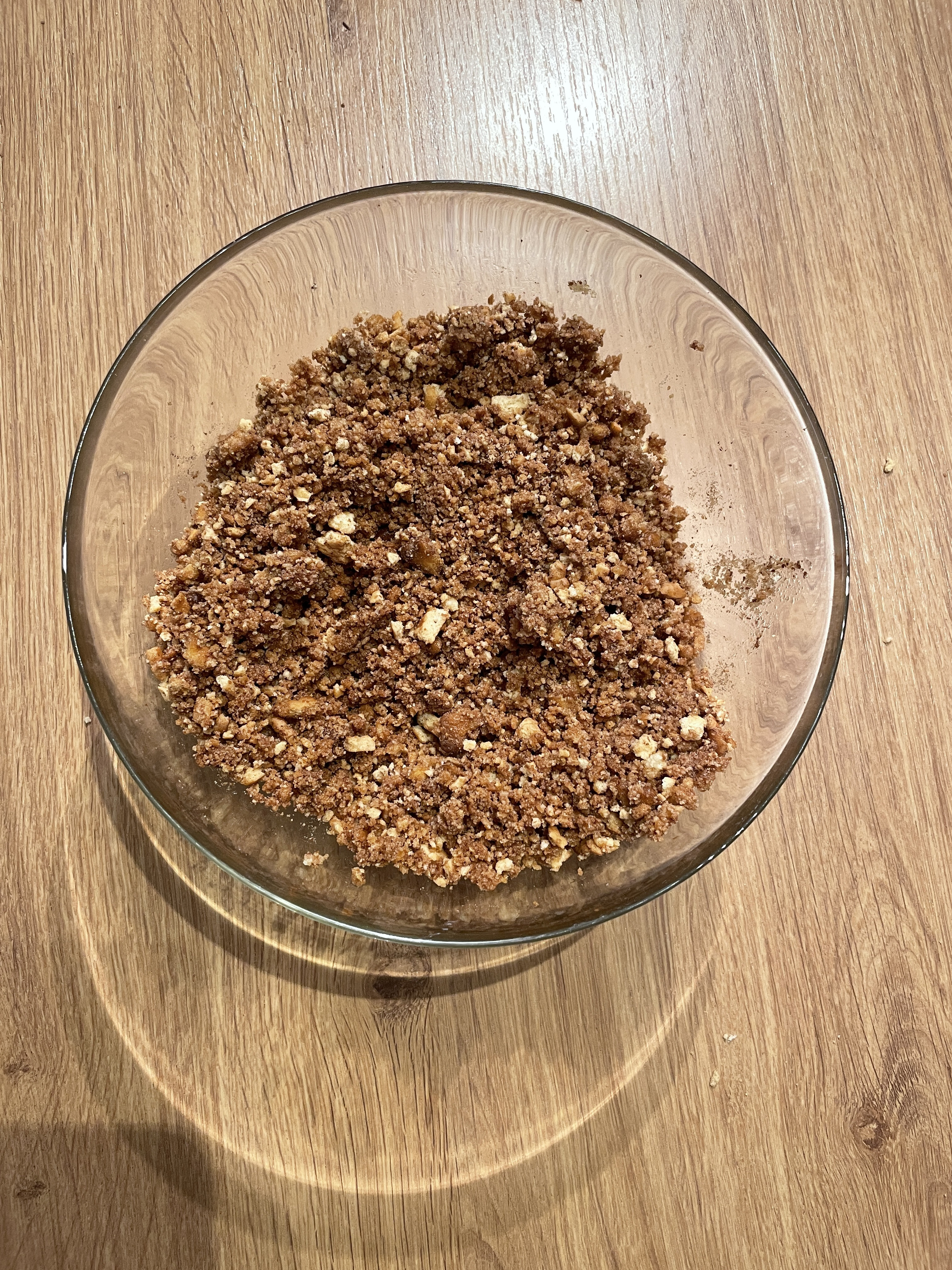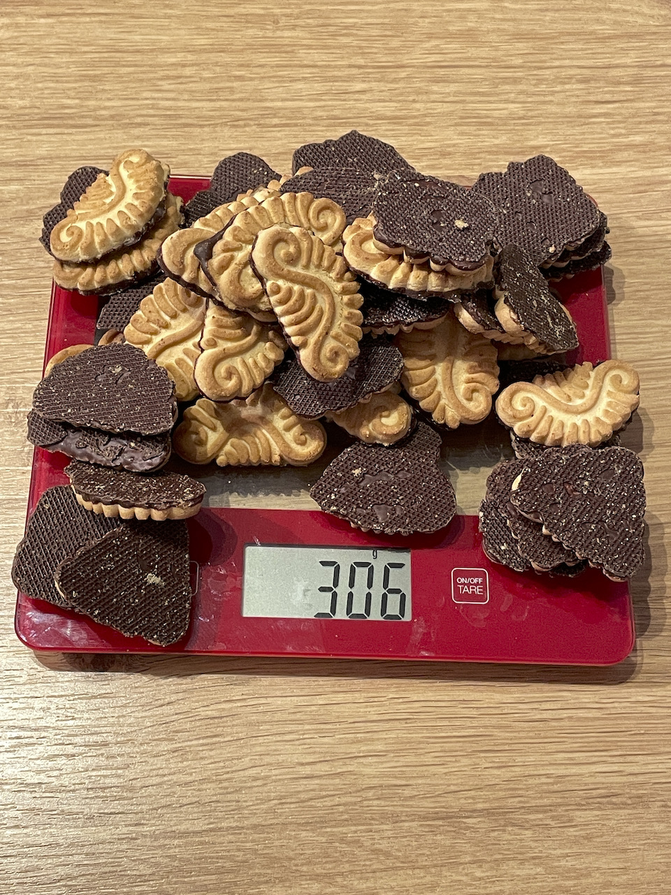 Navadne “Albert” piškote zdrobimo. Drobtine okoli ne letijo, če damo v vrečko in jih z valjarjem drobimo. Se dobijo tudi Bambi Plazma drobtine a to sploh ni tako zabavno, kot tolčt po piškotih z valjarjem in poslušat kako se drobijo.