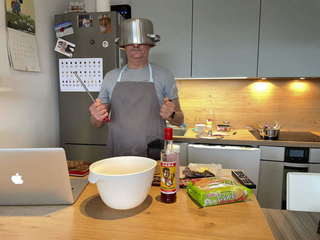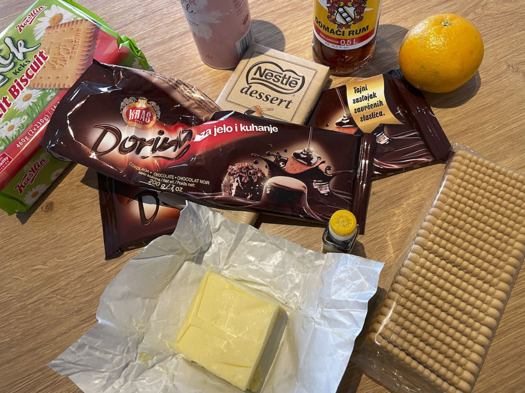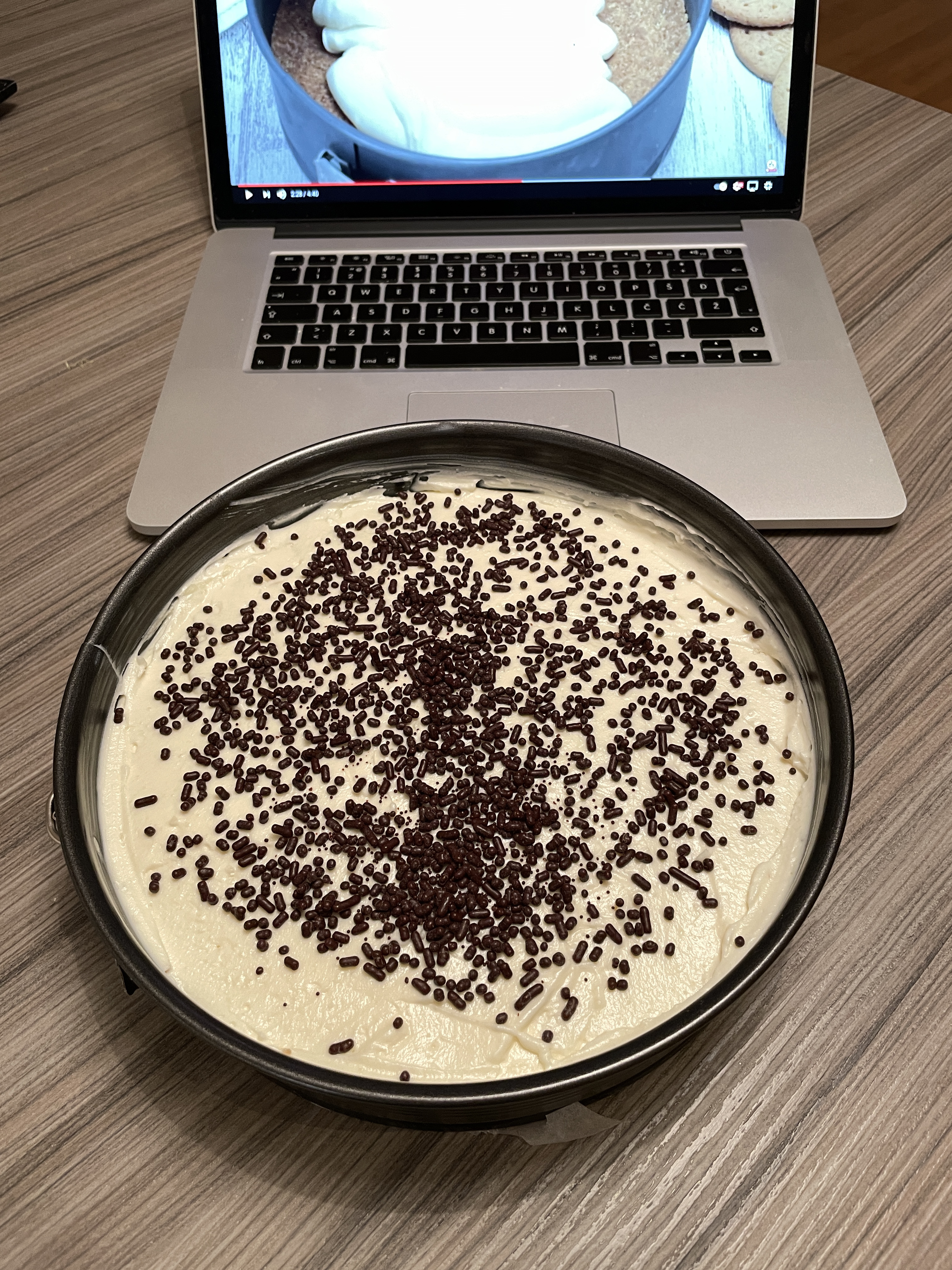 Zmes damo na piškote, čimbolj zravnamo, po želji okrasimo, poravil sem navadne čokoladne mrvice, ki sem jih našel v omari. Nestrpno čakamo naslednji dan, da poskusimo. Mogoče torta ni bila najlepša, a za prvič kar uredu. Sodelavci so bili kar zadovoljni, so rekli, da lahko še kdaj naredim.