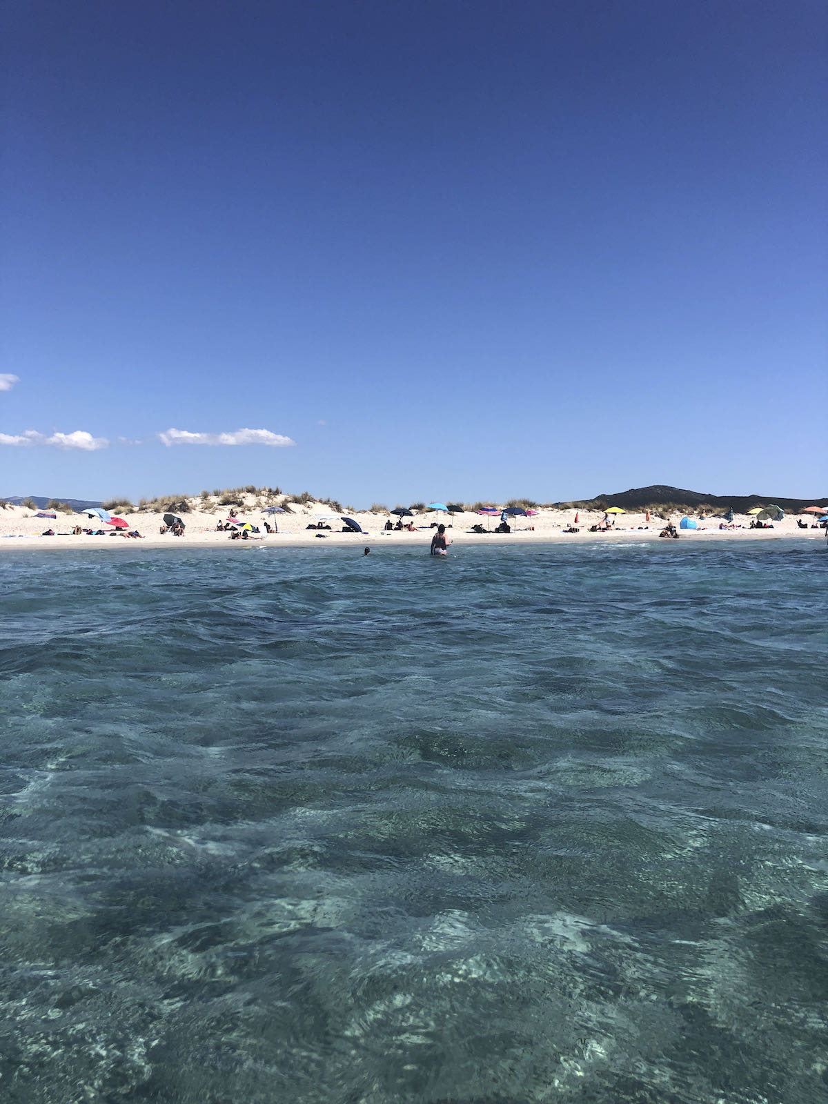 Šla sva na izlet, drugo plažo, Porto Pino – Arenas Biancas. Plaža z belim peskom in lepim modrim morjem.