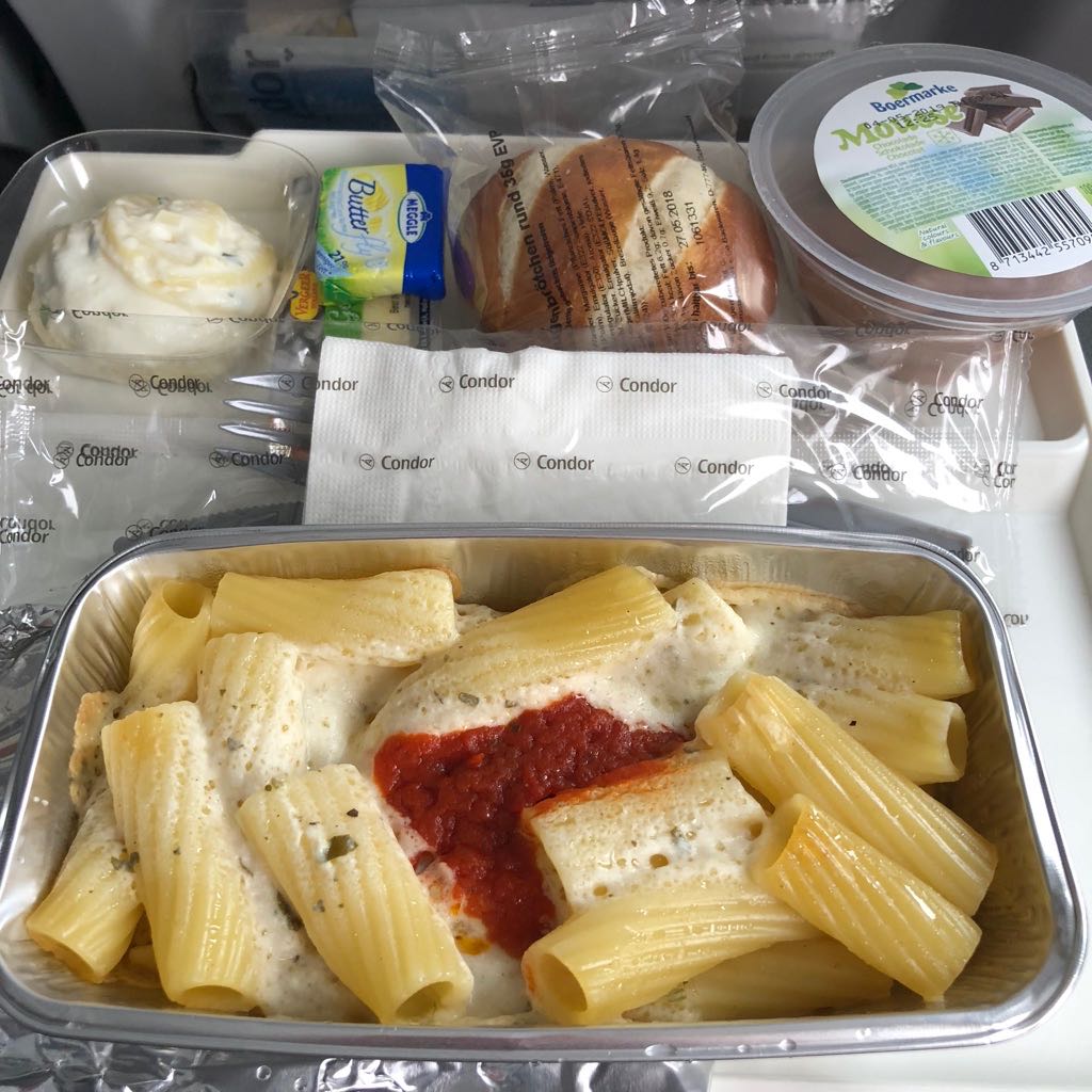 Mi na letalu smo dobili, čisto navadno klasično večerjo. Leteti z Condorjem je res pravo doživetje. Kave niso stregli, ker so pozabili lončke doma. V tiste za sok, po letalskih predpisih ne smeš dat kave. Sem imel spet srečo in imel 2 sedeža samo zase.Ko sem prišel, domov sem imel prevelik kufer za vsako omaro in sem ga lepo na bolhi prodal, za več kot sem sam plačal zanj.